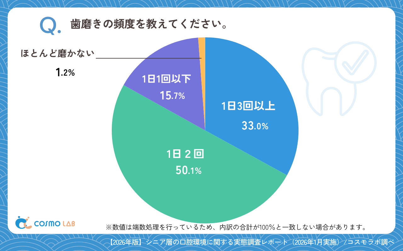 歯磨きの頻度は「1日2回」(50.1%)が最多で、「1日3回以上」(33.0%)も続きました。