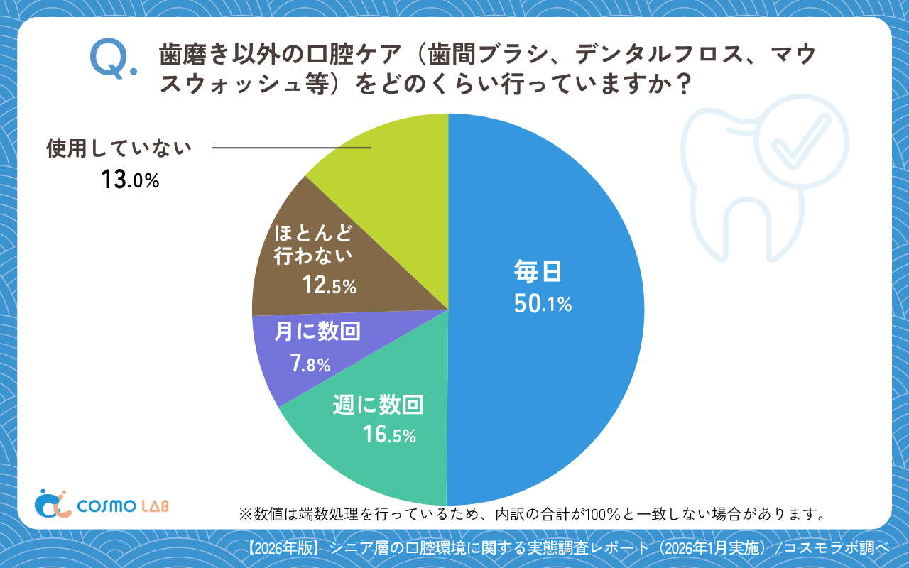歯磨き以外の口腔ケアは「毎日」(50.1%)が最多となり、補助清掃の実施が広く浸透していることが明らかになりました。一方で「週に数回」(16.5%)、「月に数回」(7.8%)に加え、「使用していない」(13.0%)、「ほとんど行わない」(12.5%)も一定割合存在します。