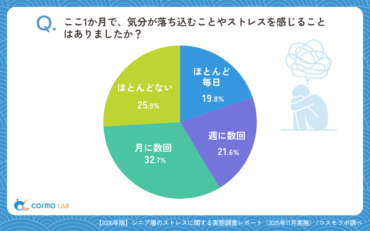本レポートでは、シニア層を対象に「ストレス・気分の落ち込み」に関するアンケート調査の結果を分析しました。ストレスを感じる頻度や継続時間、生活への影響、原因、対処行動、日常の心がけ、必要とされる支援を整理し、心身の不調と生活課題に沿った情報を提供いたします。