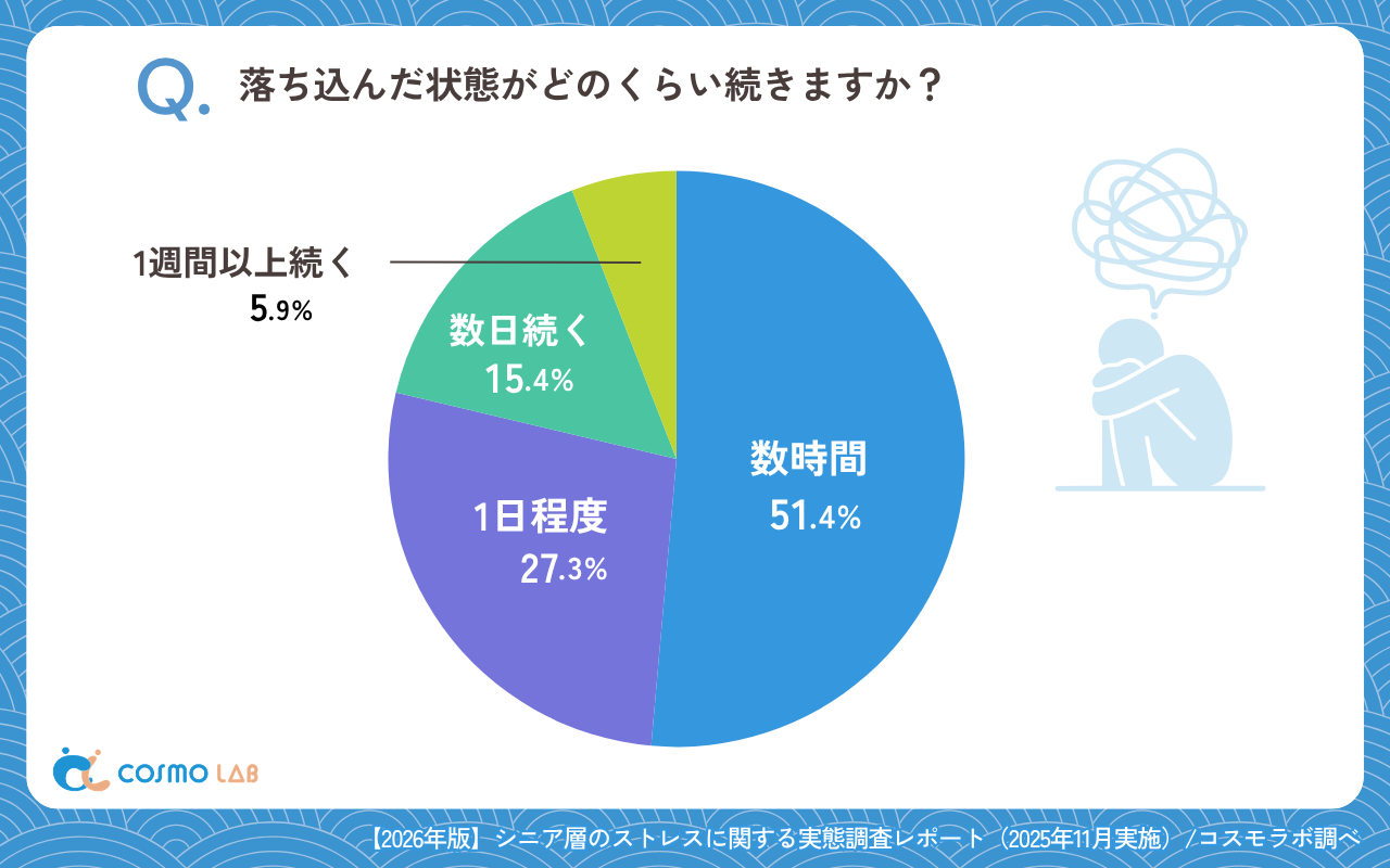 「数時間」(51.4%)と回答した層が過半数で、「1日程度」(27.3%)という回答が続きました。一方で「数日続く」(15.4%)と「1週間以上続く」(5.9%)と回答した層も見られました。