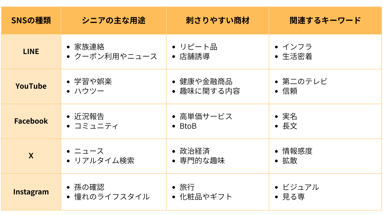 このような状況下で、シニアがSNSに求める要素は以下の通りです。