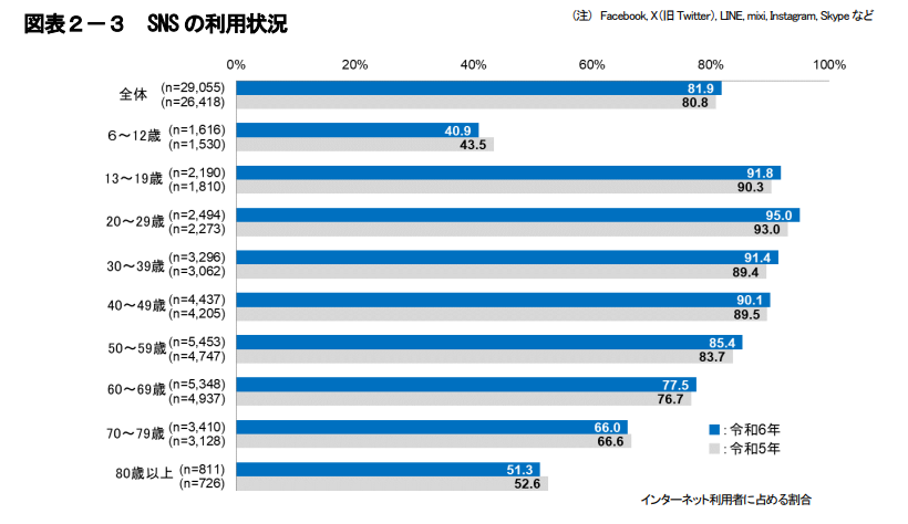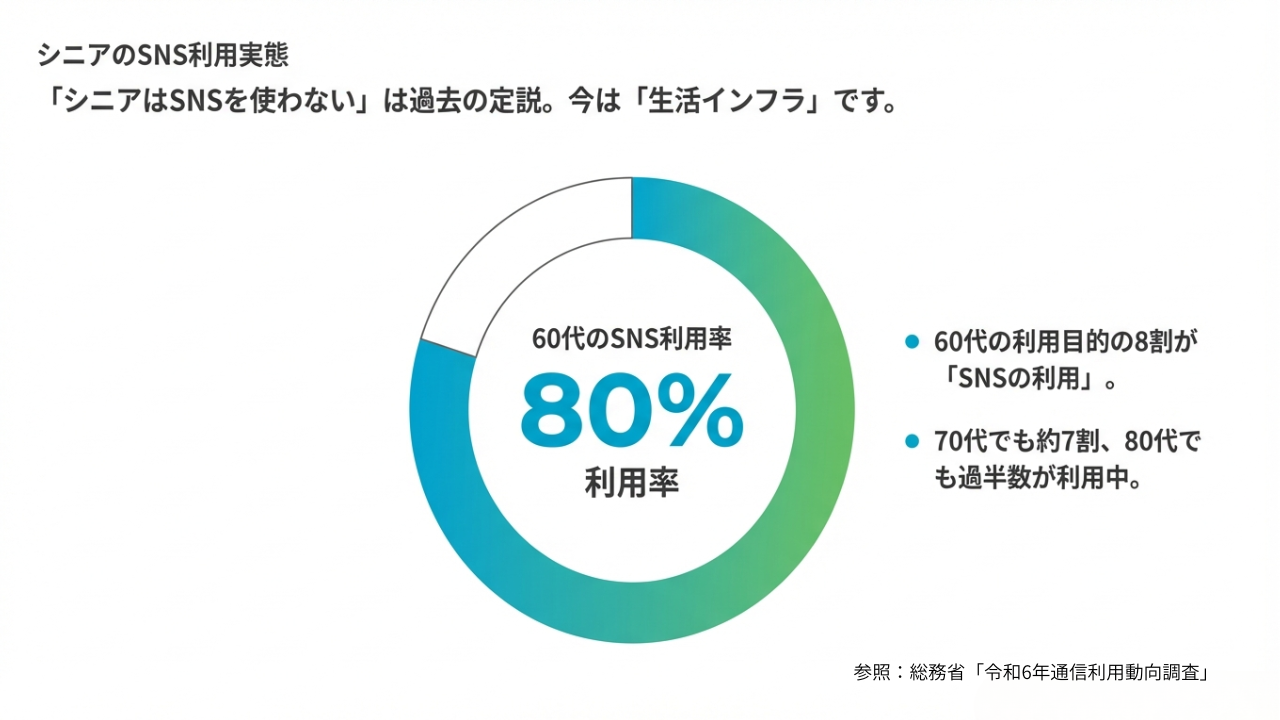 総務省の「令和6年通信利用動向調査」によると、60〜69歳のインターネット利用者のうち、SNSを利用している人の割合は約8割に達しています。
