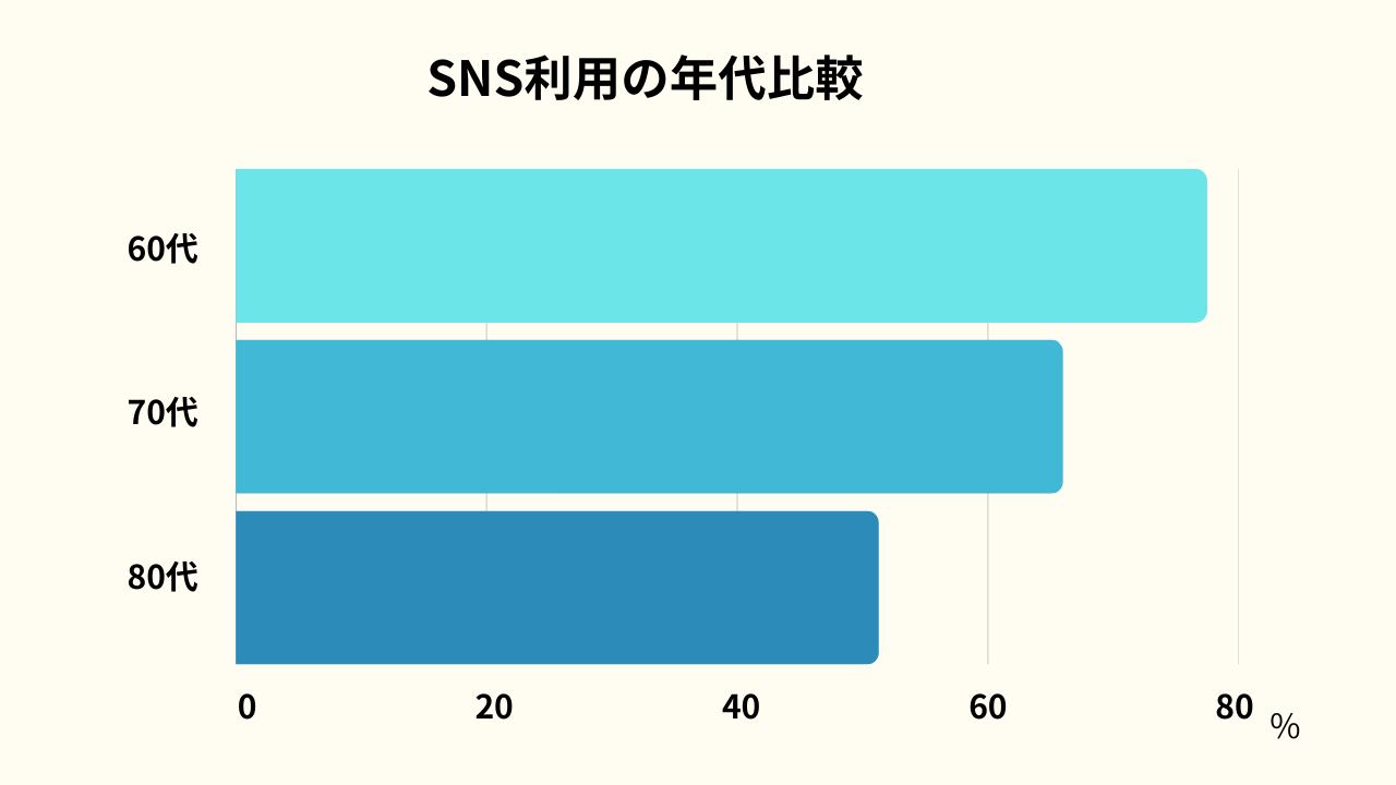 総務省が発表しているデータによると、シニアのSNS利用状況は、60代で約8割・70代で約7割と高いことがわかります。80代の場合にも、半数以上がSNSを利用しています。